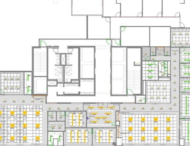 We conducted a detailed survey of the existing facilities to repurpose critical infrastructure, ensuring an efficient transition to the project’s new zoning. Electrical plans, HVAC systems, fire protection, smoke detection, plumbing, and special systems were designed.